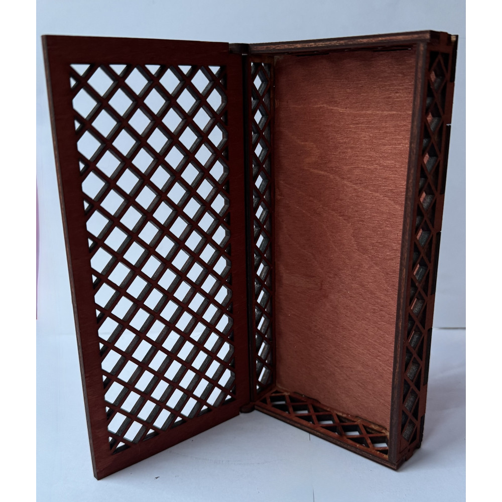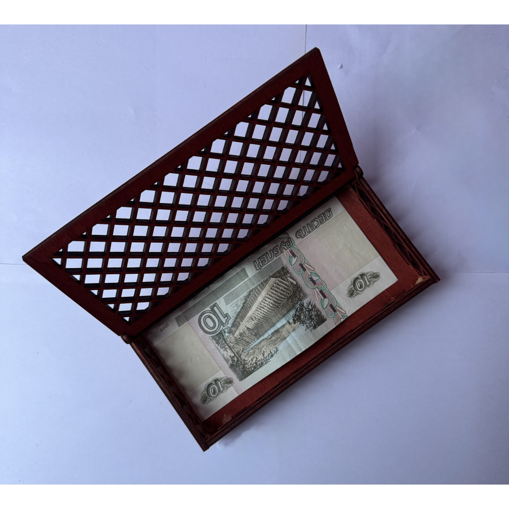 Эта коробочка ломает стереотипы о скучных денежных подарках. Главная изюминка модели — уникальная технология сквозной выпиловки (декоративный «ромбик»). Благодаря этому коробочка визуально невесома: она словно парит в воздухе, демонстрируя содержимое с двух сторон.